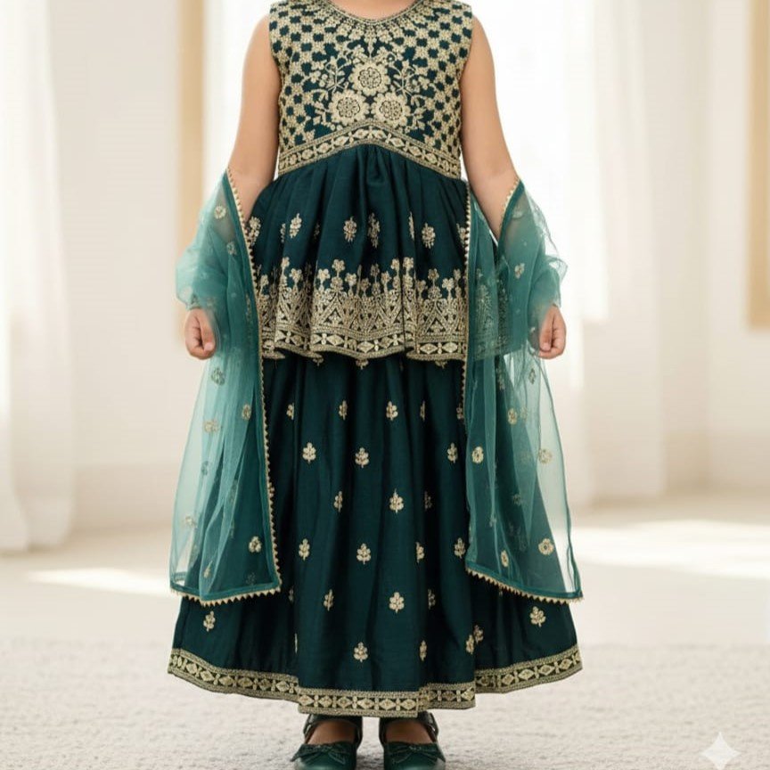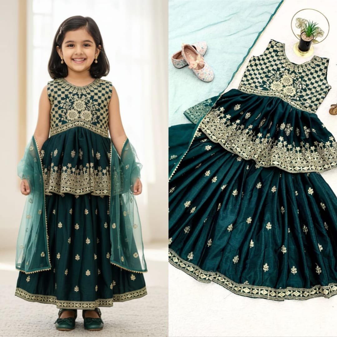 Presenting New Designer Kids Choli Palazzo Dress Collection In Pure Chinnon With Heavy Embroidery Sequence Work. Top-Bottom And Dupatta Set Fully Stitched Ready To Wear.