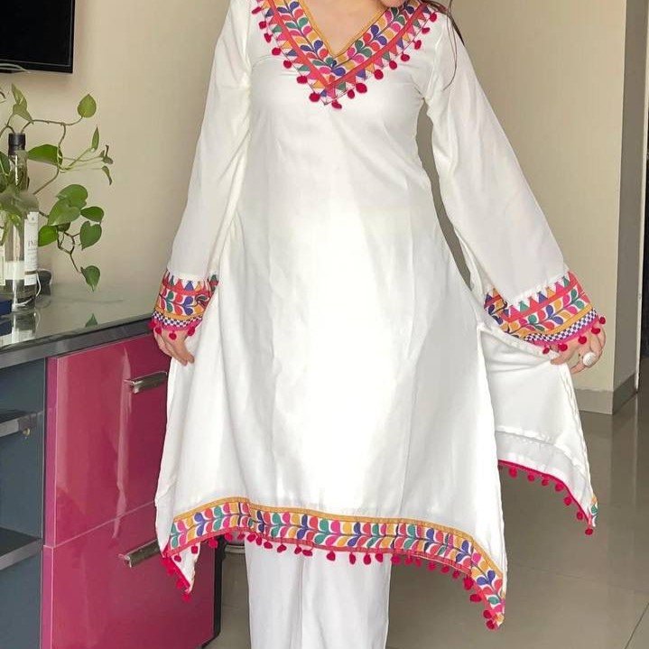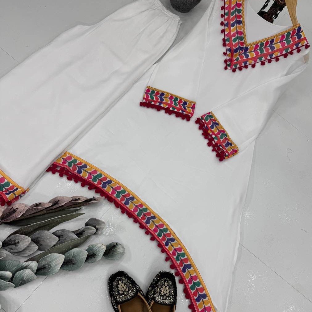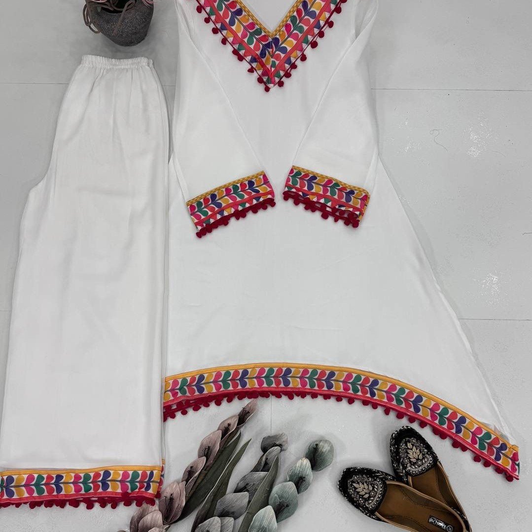 Make a statement with this designer heavy faux georgette digital print salwar suit featuring beautiful pum-pum lace detailing. This fully stitched set includes a gorgeous printed top with micro cotton inner and matching palazzo pants — perfect for parties, festivals, and special occasions.