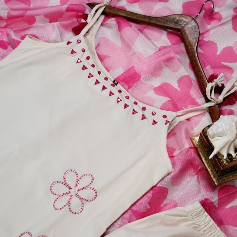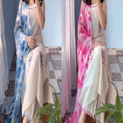 Stunning Heavy Rayon Slub 3-piece suit set with embroidery work, matching pant, and Kota Checks digital print dupatta. Soft, breathable fabric — perfect for summer. Available in Pink and Blue.